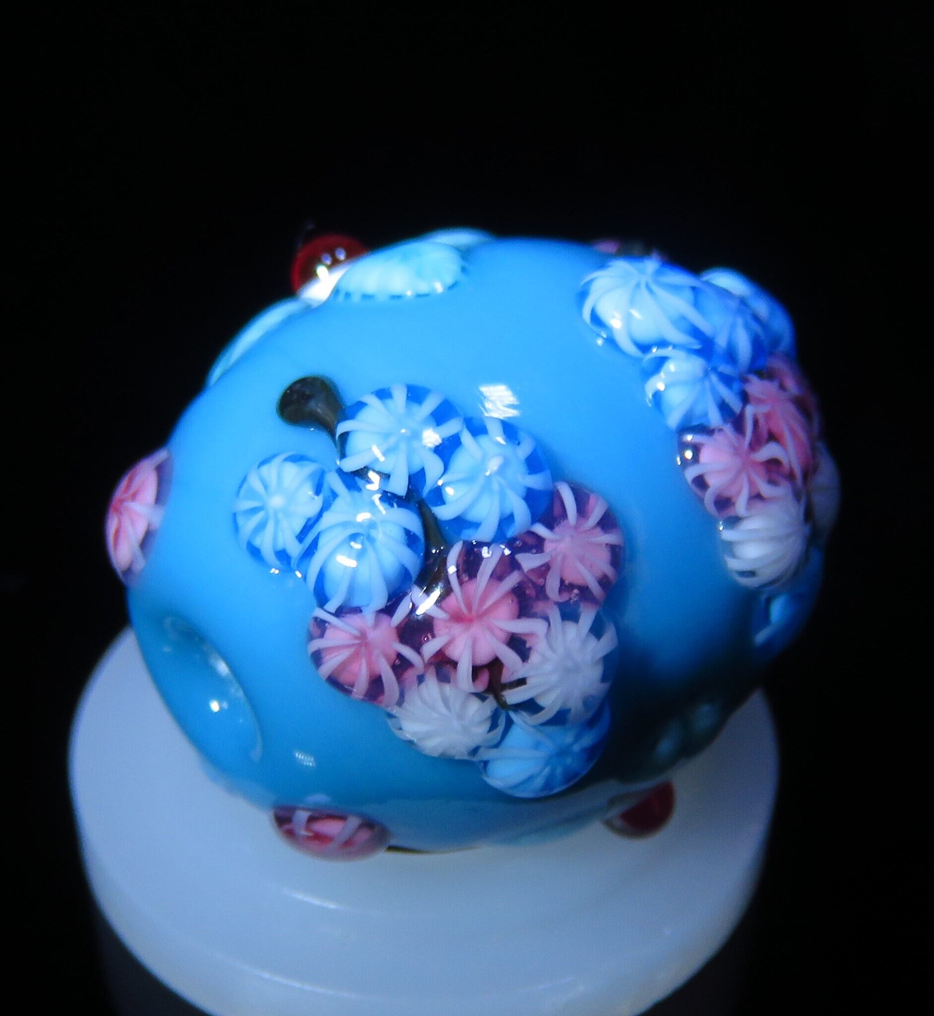 葡萄模様のグラスビーズです。ビーズサイズ:径約φ18.6(+ドット高さ約1.5mm×2)×長さ約22.5mm 穴径:約3.2mm 重さ:約13g 材質:ガラス