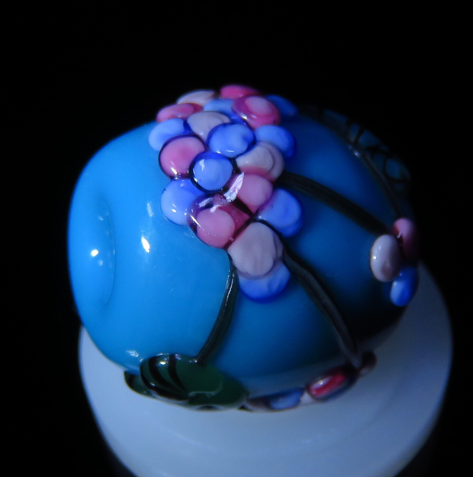 葡萄模様のグラスビーズです。ビーズサイズ:径約φ17.3(+ドット高さ約1.5mm×2)×長さ約19.4mm 穴径:約3.5mm 重さ:約10.8g 材質:ガラス